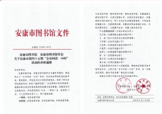 2020年6月--8月,在世界环境日、父亲节、建军节等节庆纪念日组织“为爱朗读”微信社群参与安康市图书馆和安康市图书馆学会组织的“全市同读一小时”活动,陈佳老师获个人优秀组织奖3次,为爱朗读社群获优秀奖3次。