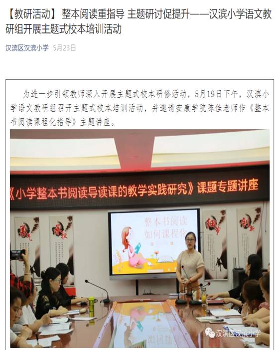 2020年5月19日,应汉滨小学邀请,为汉滨小学语文教研组全体教师做《整本书阅读课程化指导》专题讲座。
