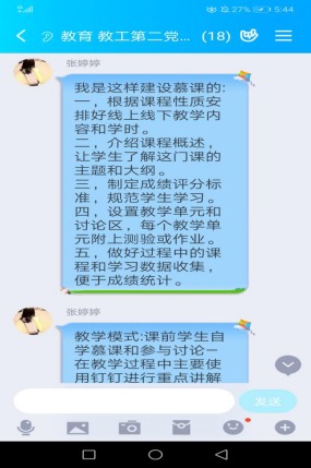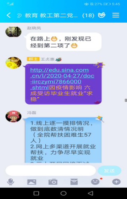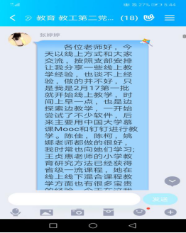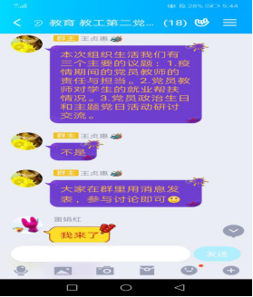 此次主题党日活动采取线上交流的形式,全体党员主要围绕“疫情期间党员教师的责任与担当”、“党员教师对员工的就业帮扶情况”等议题进行讨论。支部组织委员张婷婷首先做了交流发言,她结合疫情期间线上教学的经历谈了体会,分享了自己在慕课建设中的心得和线上教学经验,充分得到了大家的好评。其他党员都交流线上教学的心得体会,纷纷表示在使用多元化的工具与手段践行党员教师的责任担当的同时,还要充分挖掘疫情防控中的思政元素,内化于心,外化于形,不仅传播知识,还要努力强化疫情期间的思想引领和心理辅导。