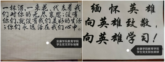 活动在三个平台同时开展:自主祭奠,同学们登录中华英烈网,在人民英雄纪念碑前,为英烈献花,学习英雄事迹,留下感言寄语;发挥专业特长,用书法作品、剪贴画、手抄报、段视频等各类作品表达对英雄的尊敬、书写感言寄语缅怀英雄故人,并在tyc122cc太阳成集团员工党支部群、tyc122cc太阳成集团班团干部群等QQ群同步分享;利用安康先锋智慧党建平台进行线上讨论,加深思想认识,坚定理想信念。