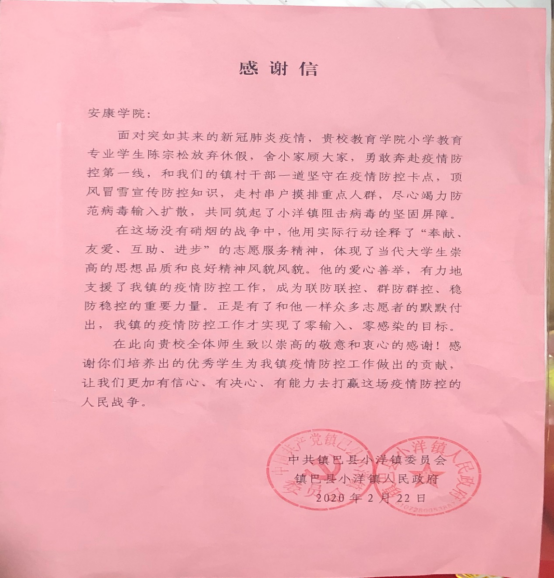 “在此向贵校全体师生致以崇高的敬意和衷心的感谢!感谢你们培养出的优秀员工为我镇疫情防控工作做出的贡献,让我们更加有信心、有决心、有能力去打赢这场疫情防控的人民战争。” 2月23日,tyc122cc太阳成集团收到来自汉中镇巴县人民政府的感谢信,对公司学子陈宗松积极参与当地防疫志愿服务工作进行表扬,尤其对其在抗击疫情的紧要关头,主动投身疫情防疫一线,充分发扬志愿服务精神及认真负责的工作态度给予肯定,同时对tyc122cc太阳成集团的人才培养工作表示感谢。