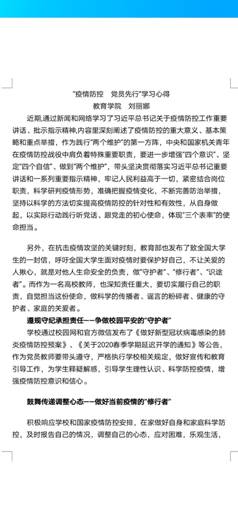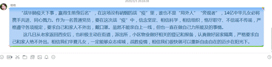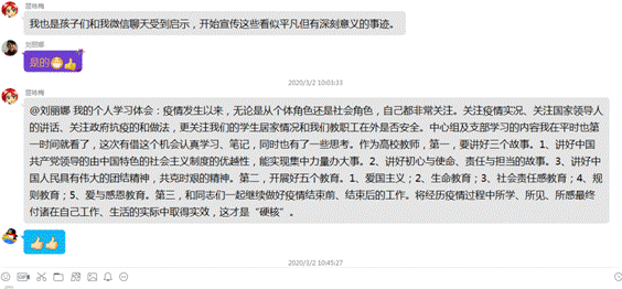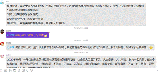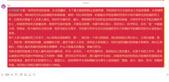 通知发出后,大家的积极性和参与度非常高,支部全体党员纷纷在QQ群里发表自己的学习感悟,互相讨论和交流学习心得体会。分别交流了近日追踪疫情报道、居家办公的感受,并结合自身工作学习生活,表达了虽不能奋战在抗击疫情的第一线,但对中国疫情防控的必胜信念、对中国特色社会主义制度的强大自信,以及对学校相关领域制度建设的关注和探索。