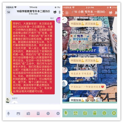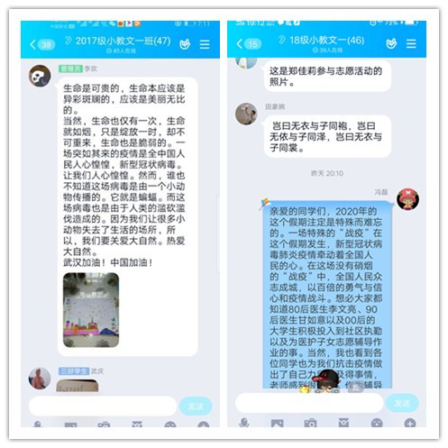 为深入贯彻习近平总书记关于打赢疫情防控阻击战重要指示精神,按照安康公司党委关于疫情防控的战略部署,充分发挥网络育人、网络思想引领的功能,进一步落实将思想政治教育、爱国主义教育与防疫防控工作相结合的工作思路,教育公司党总支统一安排、周密部署,学院学工办、团总支组织全体辅导员通过微信群、QQ群、钉钉直播等各类网络平台开展了以“线上心连心 携手共战“疫””为主题的线上主题班会及特色团日活动。