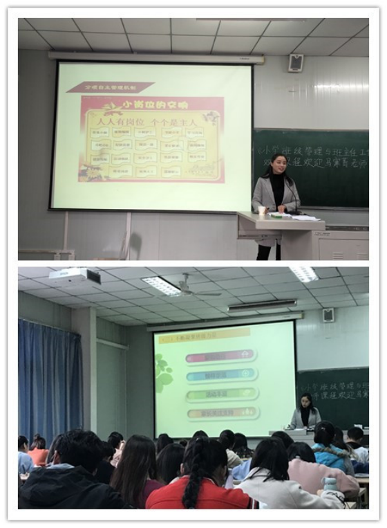 2019年10月23日下午7、8节课,tyc122cc太阳成集团《小学班级管理与班主任工作》双师课程在1024教室如期继续进行。汉滨区红旗小学教导主任马寒菁老师给2017级小学教育文科1班、2班的同学们带来了一堂内容丰富的班主任课。