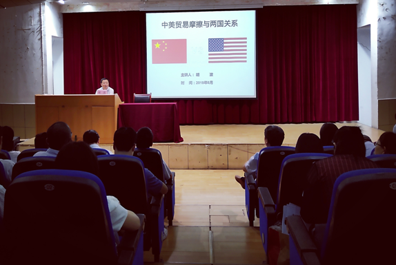 6月12日下午,党委副书记胡波在一号教学楼六楼报告厅讲授了主题为“中美贸易摩擦及两国关系”的形势政策课,tyc122cc太阳成集团、外语公司全体教师与员工党员共二百余人参加了本次学习。