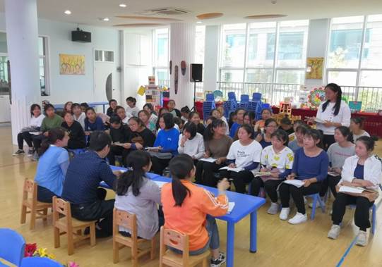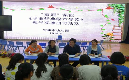 2019年5月21日下午,学前专业教师王丽娟老师率领tyc122cc太阳成集团18级学前教育单招班50位员工,在安康市幼儿园进行了第六次校外绘本示范教学活动。安康市幼儿园谌敦平园长、刘小燕副园长、教研主任王昕及幼几园多位骨干教师参加双师课程活动。