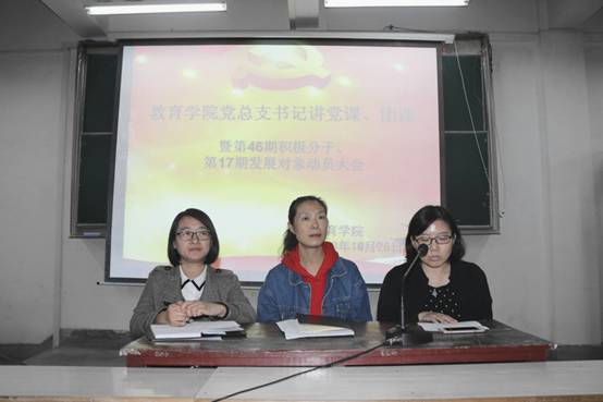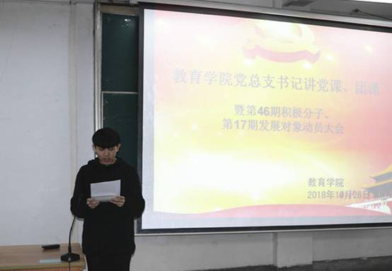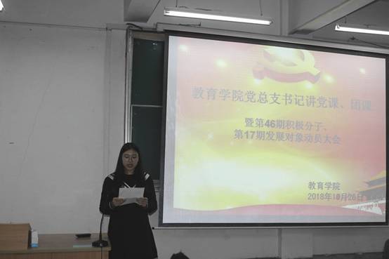 为了提高公司发展对象、积极分子对党基本知识的认识水平,增强公司广大青年团员的责任意识,进一步落实党建带团建,教育公司党总支书记讲党课、团课暨第46期入党积极分子、第17期发展对象动员大会于2018年10月26日晚在1510举行。党总支书记屈咏梅、辅导员赵晓凤、董婷瑜、全体员工党员、预备党员、第46期入党积极分子、第17期发展对象、优秀团员、班团干部代表出席了本次会议,会议由辅导员赵晓凤主持。