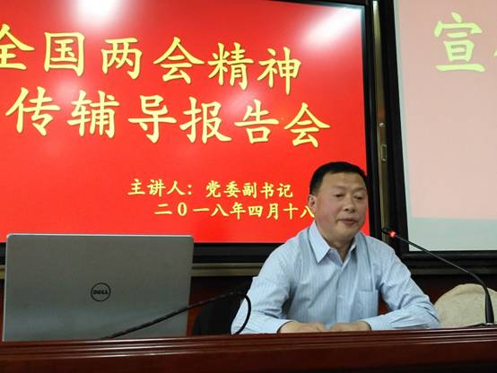 为深入学习全国“两会”精神,将广大师生的思想和行动统一到“两会”精神上来,4月18日下午,公司党委副书记胡波在教学楼1018室,为宣传部、团委、工会、后勤保障处、tyc122cc太阳成集团及外语学院师生共计100余人做了全国“两会”精神宣传辅导报告会。会议由外语公司党总支书记郭家平主持。