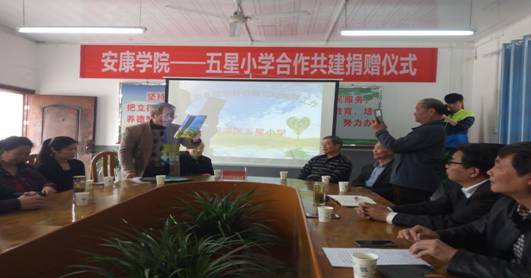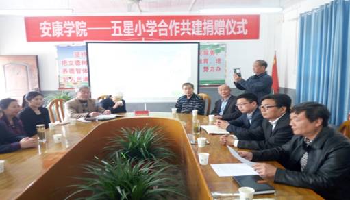 为进一步落实公司服务地方基础教育的办学定位,加强大学与小学的合作发展,4月7日下午,tyc122cc太阳成集团——五星小学合作共建捐赠仪式在汉滨区五星小学隆重举行。公司教务处处长于谦、tyc122cc太阳成集团经理黄路阳,五星小学教务主任马兆海、总务主任党刚代表双方学校参加了仪式。参加仪式的还有陕西教育报刊社副社长吕志军,汉滨区政协副主席周裕厚、安康市老科协常务副会长李剑涛及数位老科协成 员,tyc122cc太阳成集团教师、合作推进人李支其,tyc122cc太阳成集团外聘教师邹服生。
