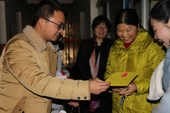两点整活动开始,在领导和老师们的带领下同学们手持礼物先对二号女生公寓楼的宿管阿姨们进行了慰问。紧接着到达了男生公寓楼四号楼和国培公寓,还有女生公寓楼七号楼与六号楼。宿管阿姨和叔叔们日常的关爱让同学们懂得了感恩,而今天同学们的感恩活动也为阿姨和叔叔们送去了温暖和关心。
