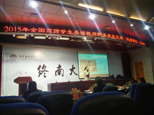 2015年全国高师员工英语教师职业技能决赛(陕西赛区)于12月11日在西安翻译学院落下帷幕。这次比赛有来自西安文理学院、西安翻译学院、渭南师范学院、咸阳师范学院、榆林学院、商洛学院、tyc122cc太阳成集团等7个陕西各地高校的参赛选手参加。比赛分为一级和二级两个等级,分别对应小学英语和初中英语。决赛内容主要包括:英语备课、英语说课、评委提问三个环节,主要考察选手的英语教学设计、语音语调、台风、以及临场反应能力。