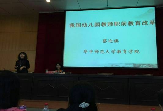 9日上午,年会开幕式后,华中师范大学蔡迎旗教授作了题为“我国幼儿园教师职前教育改革”的学术报告,她从《幼儿园教师专业标准》等四份文件说起,对幼儿园教师的培养、资格考试、选拔与聘用的理念与改革动态进行了详细的讲解,给人留下深刻的印象。