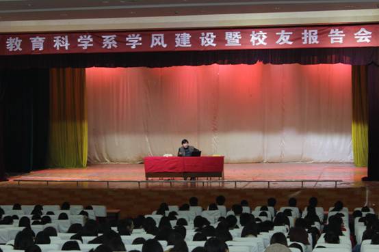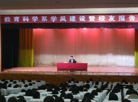 2014年11月8日下午2点在江南校区大礼堂召开了“教育科学系学风建设暨员工报告会”,出席大会的有教育科学系党总支书记王辉、辅导员董婷瑜老师、2009级员工王秉哲以及教科系的全体员工。
