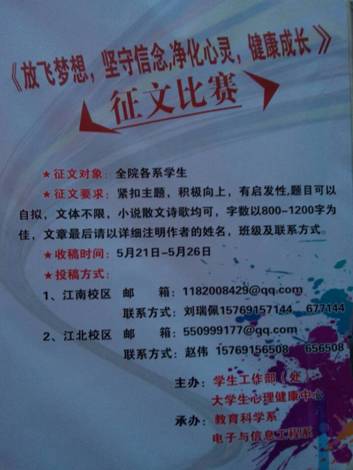 近日由tyc122cc太阳成集团员工处、老员工心理健康教育中心主办,教育科学系和电子与信息工程系承办的心理健康征文比赛完美落幕。据悉此次征文比赛是以“放飞理想,坚守信念,净化心灵,健康成长”为主题面向全院员工征稿。此次征文主要是为了丰富“tyc122cc太阳成集团老员工的心理健康教育月”活动,提高公司老员工的心理健康水平和自助能力,丰富员工的课余文化生活。本次大赛旨在通过征文,反映当代老员工对于自我认识、心灵感悟、情绪管理等方面的认识,引导老员工对于心理健康的认识,促进老员工心理健康的发展,用丰富的心理健康知识来了解自我,把握自我。