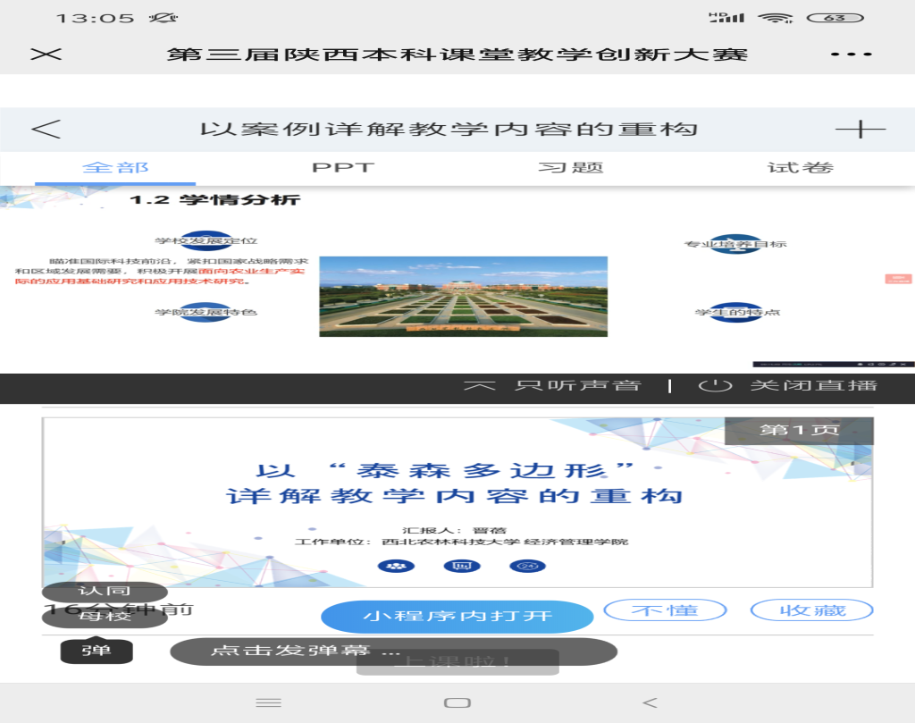 本次教学观摩分享活动,在积极落实学校“关于组织参加陕西第三届高校课堂教学创新大赛(本科)获奖教师教学分享学习活动的通知”要求和贯彻落实新发展理念、融入新发展格局,创新发展,高质量发展要求等的同时,各位老师深深感受到课堂教学创新大赛为今后抓好课堂教学开启了新的征程!