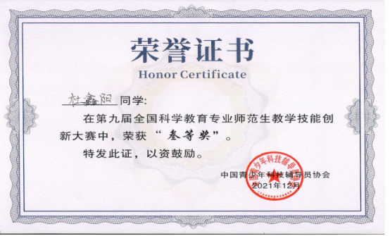 近日,“第九届全国科学教育专业师范生教学技能创新大赛”在武汉城市职业学院举行,公司姚娜老师、陈珂老师指导的员工杜鑫阳荣获三等奖。