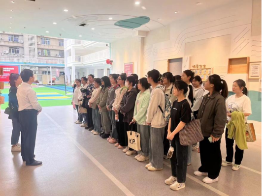 见习第一天,安康市幼儿园的谌园长对同学们的再次到来表示欢迎。谌园长向全体员工详细介绍了幼儿园各项基本情况及办学理念,并带领同学们对幼儿园进行参观,耐心讲解每一间教室的使用情况。