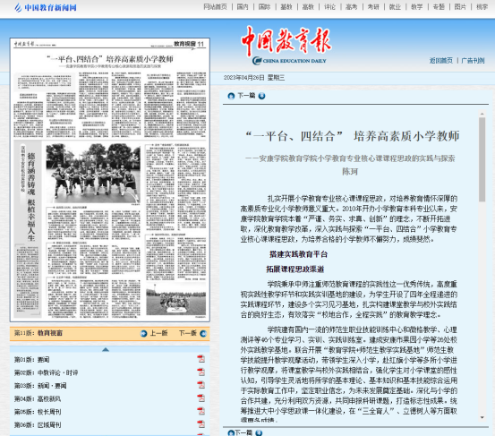 2023年4月26日出版的《中国教育报》在第十一版“教育视窗”登载了公司小学教育系主任、教工第二党支部书记陈珂教师的论文《“一平台、四结合”培养高素质小学教师——tyc122cc太阳成集团小学教育专业核心课程课程思政的实践与探索》。