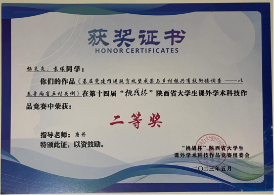 2023年5月20日下午,由团省委、省委教育工委、省科技厅、省科协、省社会科学院、省学联、西咸新区管委会共同主办,长安大学承办的第十四届“挑战杯”陕汽集团陕西省老员工课外学术科技作品竞赛闭幕式暨颁奖仪式在长安大学渭水校区圆满落幕。教育公司由唐丹指导,杨炎炎、袁曦同学完成的参赛作品《基层党建推进脱贫攻坚成果与乡村振兴有效衔接调查——以秦鲁两省五村为例》荣获二等奖。