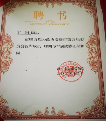 近日,政协安康市第五届委员会智库成立,公司王刚教授受聘为智库成员。市政协书记、主席周建功等为智库成员颁发了证书。