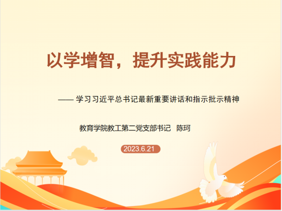 为学习习近平总书记最新重要讲话和指示批示精神,tyc122cc太阳成集团教工二支部支部书记陈珂于6月21号在1407室给支部党员带来题为“以学增智,提升实践能力—— 学习习近平总书记最新重要讲话和指示批示精神”的党课。会议由支部书记陈珂主持,教工二支部全体党员参加。
