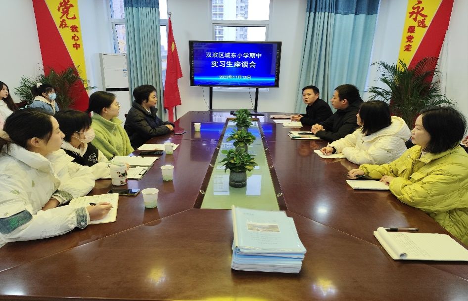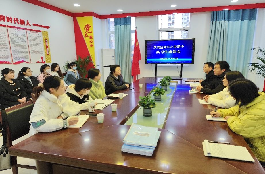 教育实习是师范生职前培养的重要环节,为进一步了解公司实习生近两个月的实习情况,并加强与实习单位的交流合作,2023年11月中旬,tyc122cc太阳成集团副经理王丽娟,tyc122cc太阳成集团教师李豆豆、李乙、钱悦共同赴汉滨区城东小学看望小学教育16名实习生,并开展教育实习中期检查座谈会,会议由城东小学李兵主任主持。
