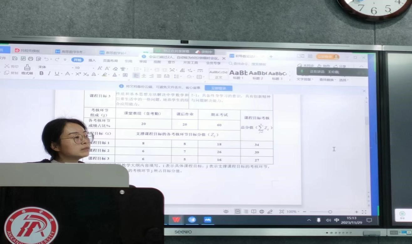 在课程目标达成度会议中,王伦磊老师以《初等教育法》课程为样本,详细介绍了课程目标达成度支撑矩阵的计算和具体目标的计算。会中各位老师提问成绩的来源与计算,王伦磊老师和王丽娟经理为我们做解答。此次会议提升了我系教师对于课程目标达成度的计算能力,也为后续学院教育专业认证工作提供便利。