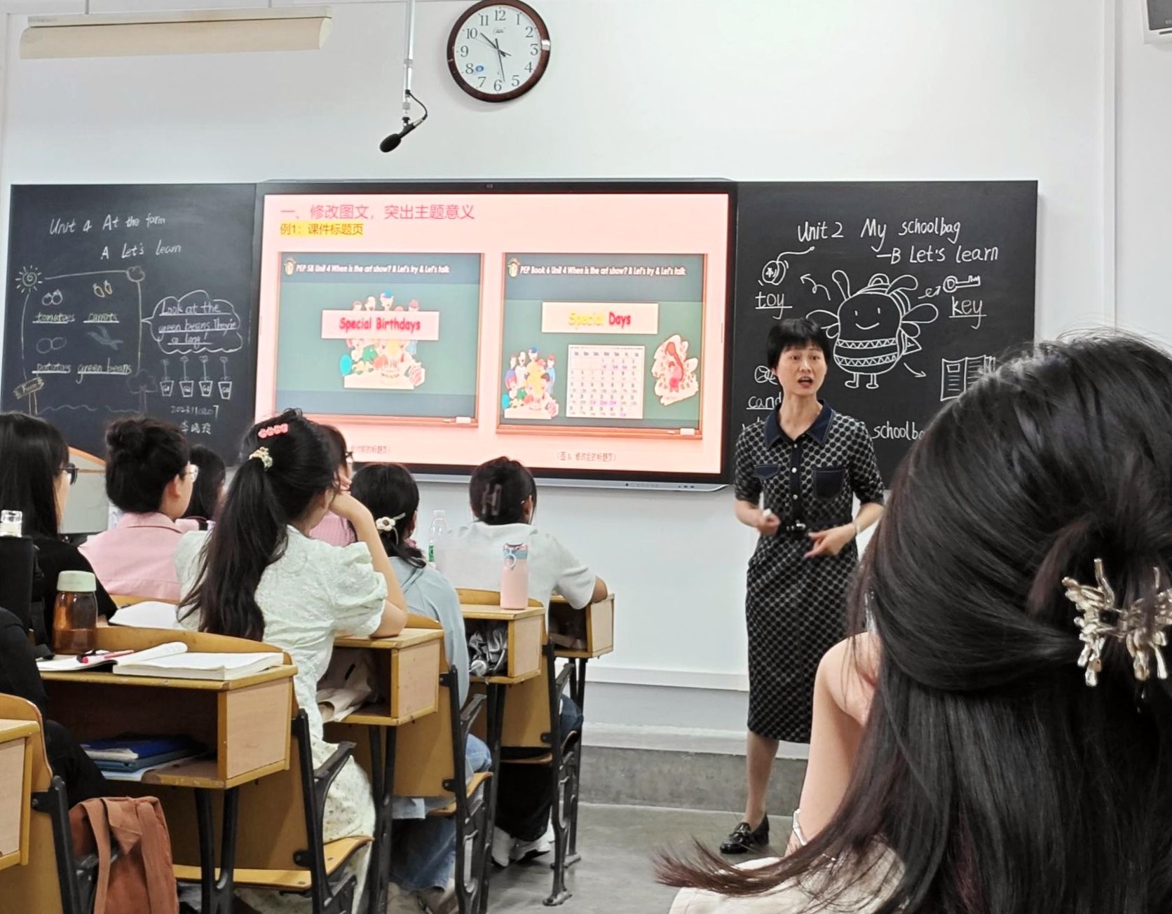 2024.4.29, 王雁群老师为21级小学教育文科1班做《基于“新课标”理念的教学课件和板书修改例说—以PEP小学英语五年级下册Unit4为例》,王雁群老师首先以小学英语PEP教材五年级下册Unit 4 When is art show 一课为例,详细介绍如何在教学课件和板书设计中渗透新课标理念,随后,对员工的板书进行点评并提出修改意见。听完讲座,员工纷纷表示受益匪浅。