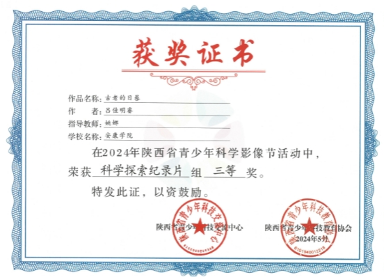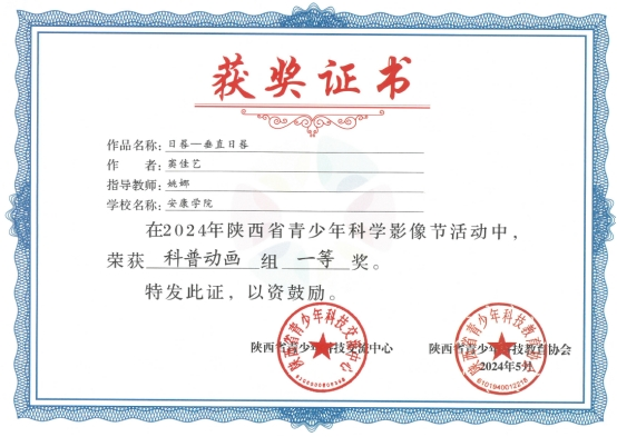 近日,2024年陕西省青少年科学影像节活动评选结果揭晓,依托陕西省安康公民科学素质创新与发展研究中心,tyc122cc太阳成集团姚娜老师指导小学教育专业员工窦佳艺完成的科普作品《日晷—垂直日晷》荣获科普动画组一等奖,小学教育专业吕佳明睿的作品《古老的日晷》获得科学探索纪录片三等奖,姚娜教师被评为优秀指导教师,tyc122cc太阳成集团获得优秀组织学校称号。