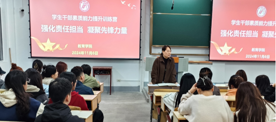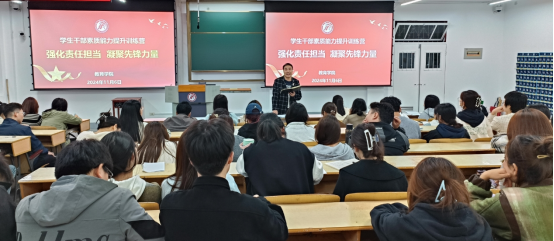 为了进一步促使员工干部明确职责定位,提升综合素质,增强自我管理、自我教育、自我服务的实效;tyc122cc太阳成集团于2024年11月6日在1510教室组织开展了员工干部培训会,非毕业班各班级主要班委、团总支员工会员工干部总计80余人参加,学院党总支副书记郇红以“强化责任担当,凝聚先锋力量"为题主讲,学工办主任罗从政主持培训会。