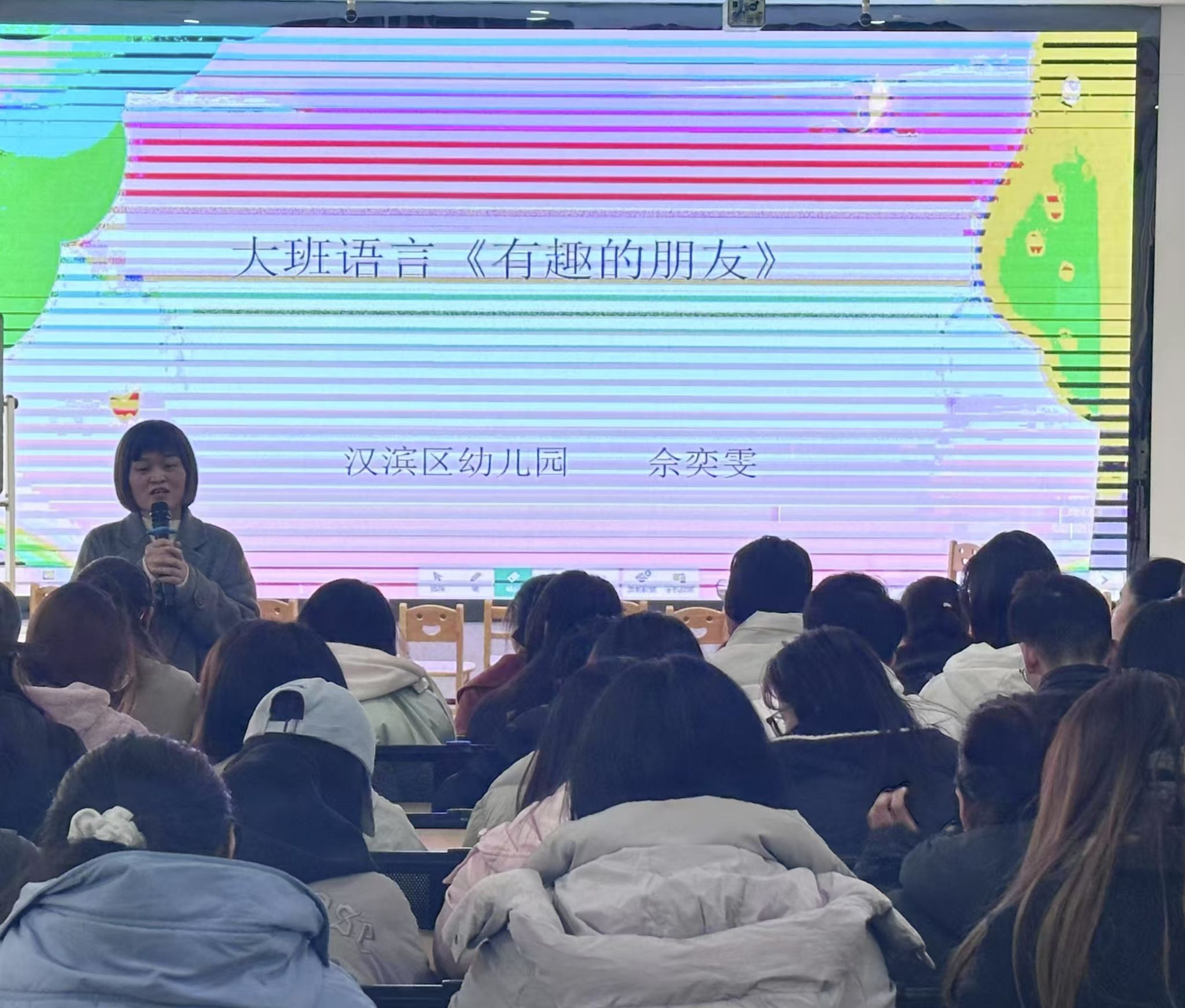 11月27日下午, 《学前儿童语言教育与活动指导》继续开展双师教学活动,学前教育2022级本科1、2班全体同学在学院姜凤坤老师的带领下在汉滨区幼儿园聆听了两节幼儿园优质课。汉滨区幼儿园李敏书记主持了本次活动。何子老师执教的数学活动《疯狂动物城》以探险情景游戏为背景,引导幼儿学习按照一定顺序观察材料,掌握材料按照某一颜色数量递增排列的规律,并通过操作尝试学习进行规律排序,帮助幼儿体会数学游戏的快乐。佘亦雯老师执教的语言活动《有趣的朋友》以绘本《跑跑镇》为载体,引导幼儿大胆想象猜测,感受不同物体在一起碰撞后的神奇变化,激发了幼儿的阅读兴趣,培养了幼儿的语言表达能力。