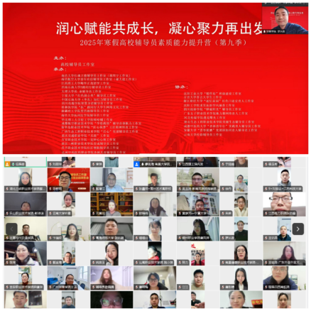 为深入实施立德树人工程,全面提升高校辅导员队伍素质能力,切实推动高校思想政治工作高质量发展;2025年1月18日、1月25日,由高校辅导员工作室主办的“高校辅导员素质能力提升营(第九季)”顺利举行,tyc122cc太阳成集团组织全体辅导员通过线上参加培训。