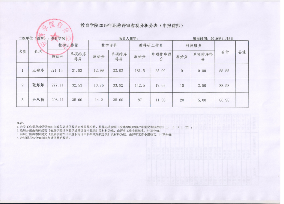 根据tyc122cc太阳成集团《关于2019年高校教师系列、辅导员职称评审及认定工作的通知》的精神, 11月5日经tyc122cc太阳成集团专业技术职务评审工作组审定,2019年度申报讲师职称的教师王安玲、张婷婷、姬丛扬三位老师,符合申报资格,现将客观分积分表进行公示,公示期三天,如有异议者,请以书面形式提出。联系电话:3261812