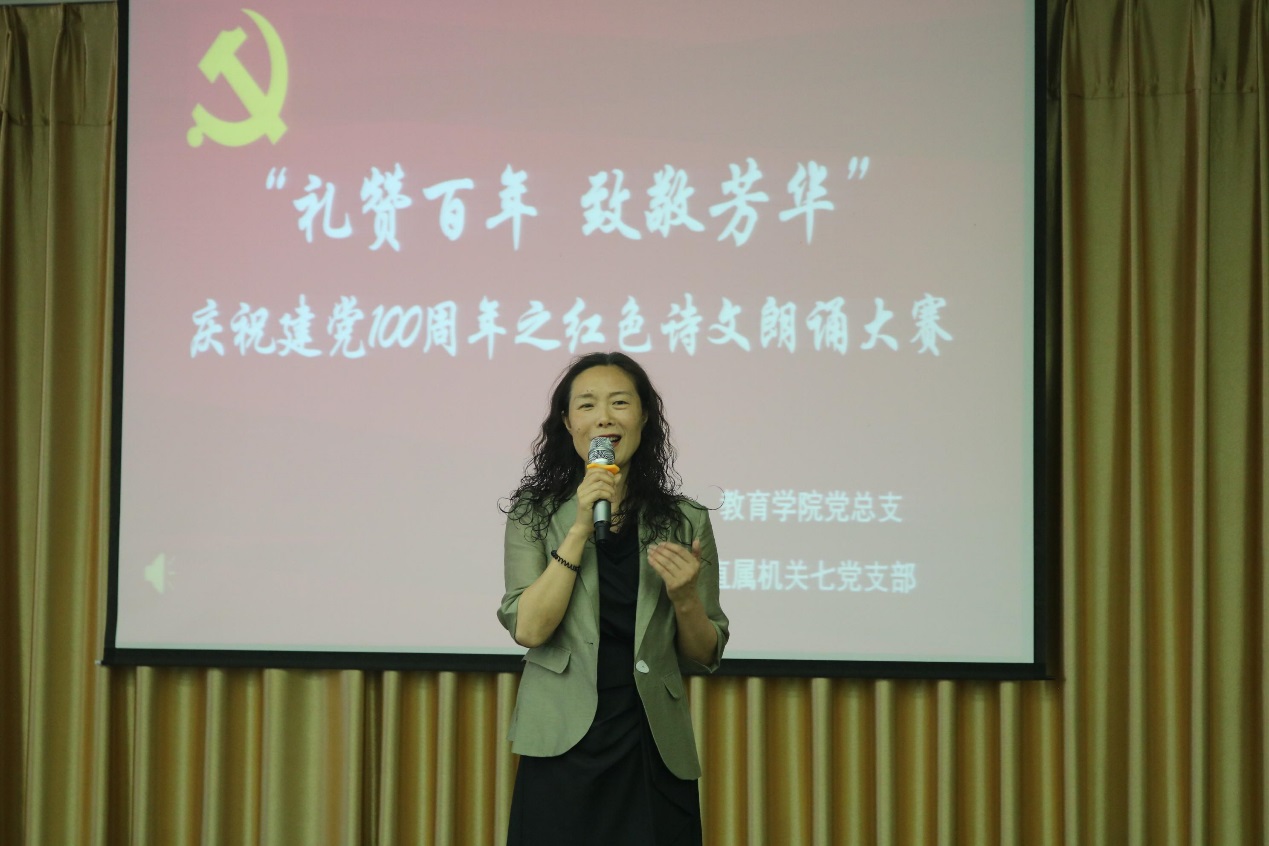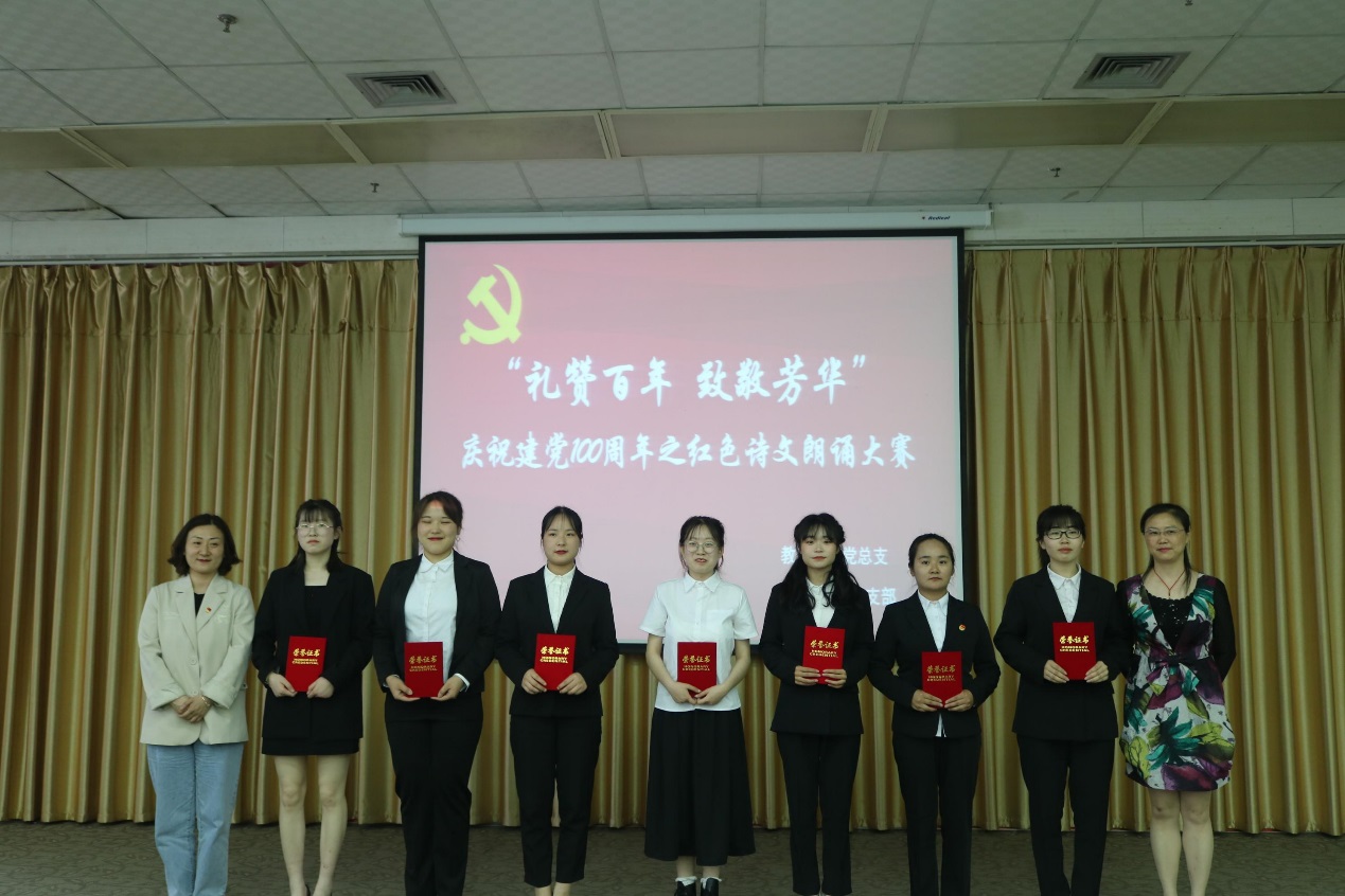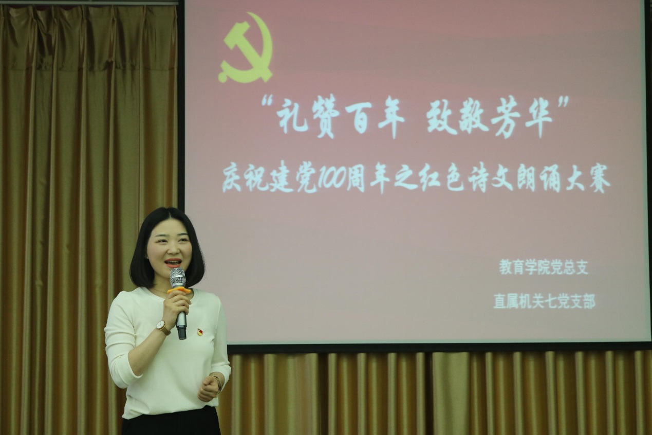 2021年5月19日下午14:30教育公司党总支与直属机关七党支部联合在图书馆六楼报告厅组织主题为“礼赞百年 致敬芳华”庆祝建党100周年红色诗文朗诵比赛。教育公司党总支共建党支部直属机关七党支部全体党员、tyc122cc太阳成集团全体教师、入党积极分子、发展对象参与本次活动。学校宣传部长鲁延安、直属机关七党支部书记丁义国、学校组织部副部长黄勇、学校学工部副部长黄娟作为特邀嘉宾出席活动。