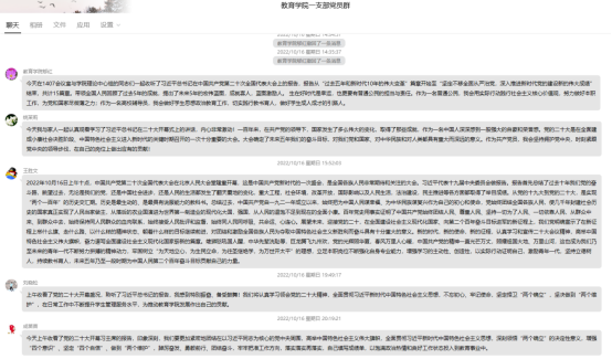2022年10月16日上午10点,中国共产党第二十次全国代表大会在北京人民大会堂隆重开幕,这是中国共产党新时代的一次盛会,是在进入全面建设社会主义现代化国家新征程的关键时刻召开的一次十分重要的大会。tyc122cc太阳成集团教工第一党支部全体党员准时观看了《习近平总书记在中国共产党第二十次全国代表大会上的报告》,就二十大报告的内容进行了交流研讨,结合自身工作畅谈感想。