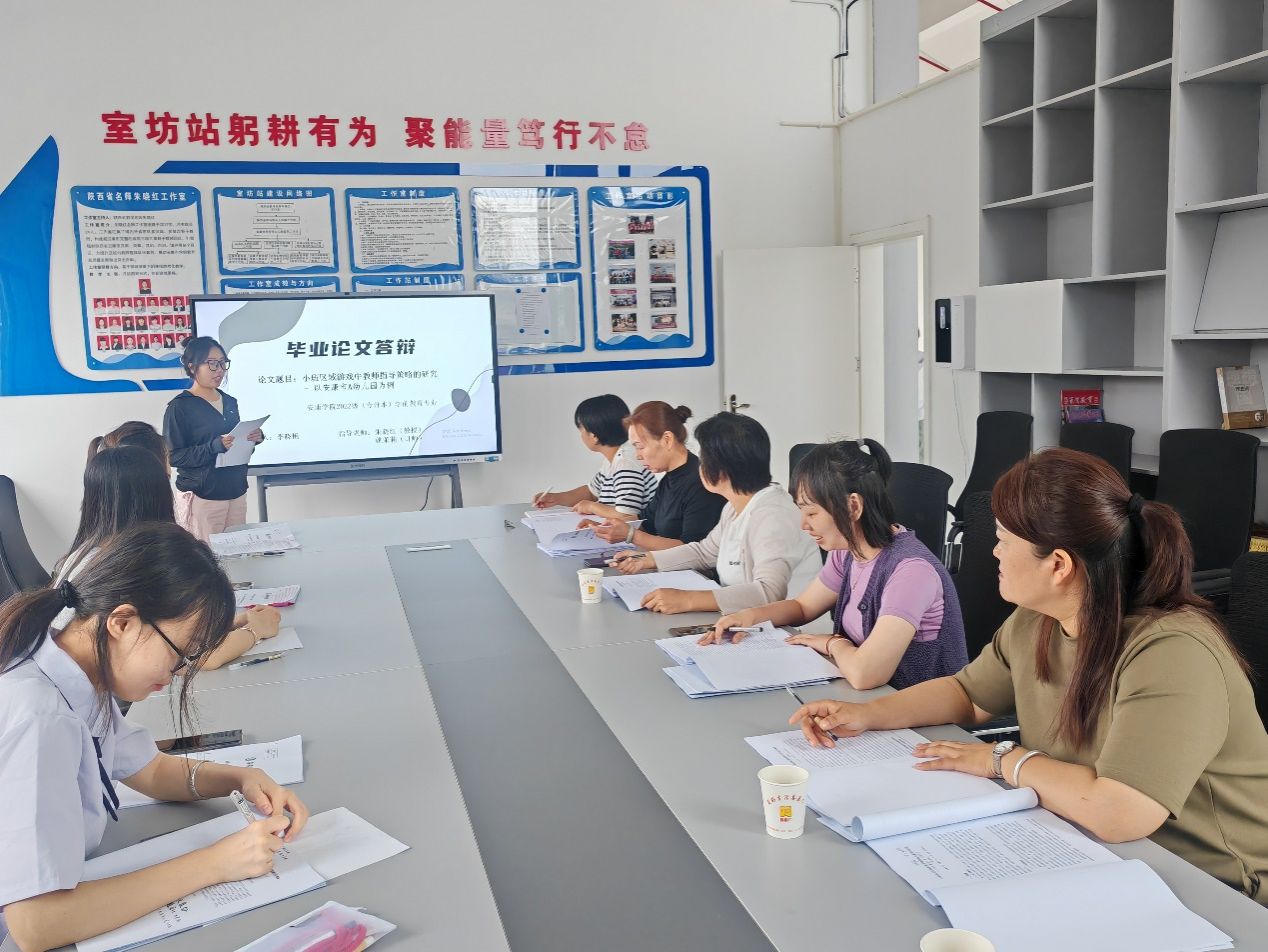 2024 年 6 月 4 日上午,tyc122cc太阳成集团学前教育专业 2024 届论文答辩工作在汉滨区铁路幼儿园会议室顺利召开。 本次答辩工作由tyc122cc太阳成集团与汉滨区铁路幼儿园合作开展。参加人员包括汉滨区铁路幼儿园书记朱晓红,担任答辩组主席;汉滨区铁路幼儿园园长袁小雪、tyc122cc太阳成集团经理王丽娟、tyc122cc太阳成集团学前系主任宋燕宇、tyc122cc太阳成集团教师姚茉莉、以及铁路幼儿园先关教师参加了此次会议。