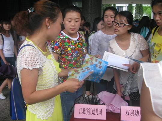 为了更好地拓宽毕业生就业渠道,落实“于培养应用型人才”培养目标,提高员工就业能力。2015年6月12日教育科学系在江南校区一号楼大厅举行专场招聘会。西安爱儿堡幼儿园、安康高新第二幼儿园等二十九家用人单位来我系招聘人才,共提供就业岗位180个,我系2015届毕业生和2016届毕业生共计300余人参加了本次招聘会。