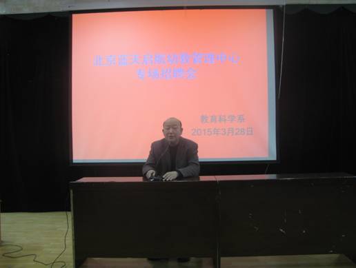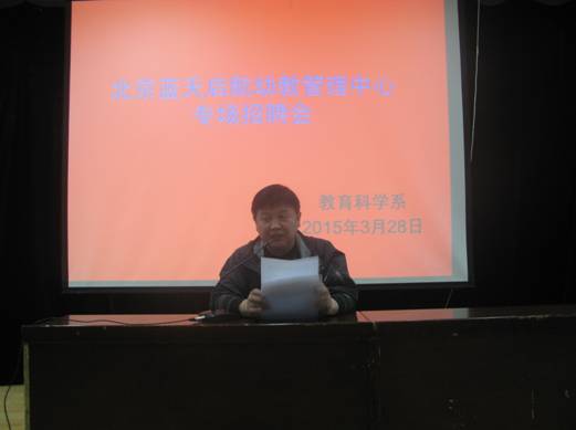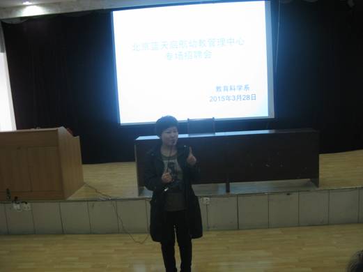 2015年 3月28日下午,“北京蓝天启航幼教管理中心”在公司江南校区1号教学楼6楼报告厅举行专场招聘会。该招聘会主要面向教育科学系2011级和2012级应届毕业生。