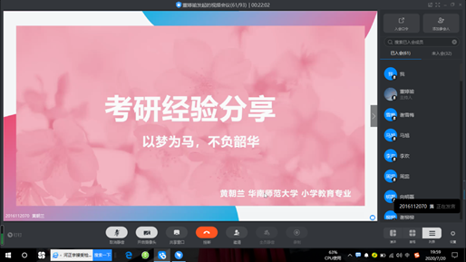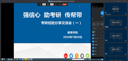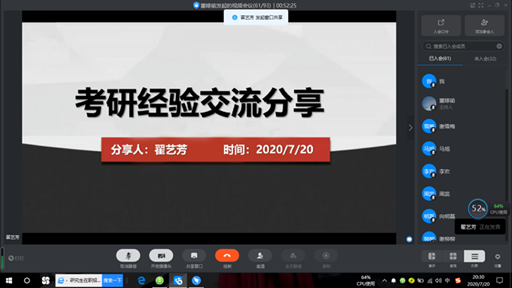 为帮助备考2021年研究生考试的员工更好地了解考研形势,明确考研规划,调整复习方法,减轻心理压力,营造良好的考研氛围,tyc122cc太阳成集团7月20日通过钉钉软件举办第一期考研经验分享交流会,由tyc122cc太阳成集团2017届毕业生李月星、2018届毕业生翟艺芳、2018届毕业生朱沈玮以及2020届毕业生黄朝兰主讲,员工党支部书记、辅导员董婷瑜主持,2017级80余人参会。