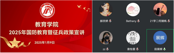 加强国防教育,助力教院莘莘学子全面理解春季高校征兵政策,做好应征入伍动员;tyc122cc太阳成集团于202519日通过线上会议方式开展了2025年国防教育暨征兵政策宣讲会公司退役并考研升学员工田展辉、退役复学在校生许楠楠分享军旅生涯和心路历程各年级班委及意向参军入伍员工30余人参加活动,宣讲会由学工办主任罗从政主持。