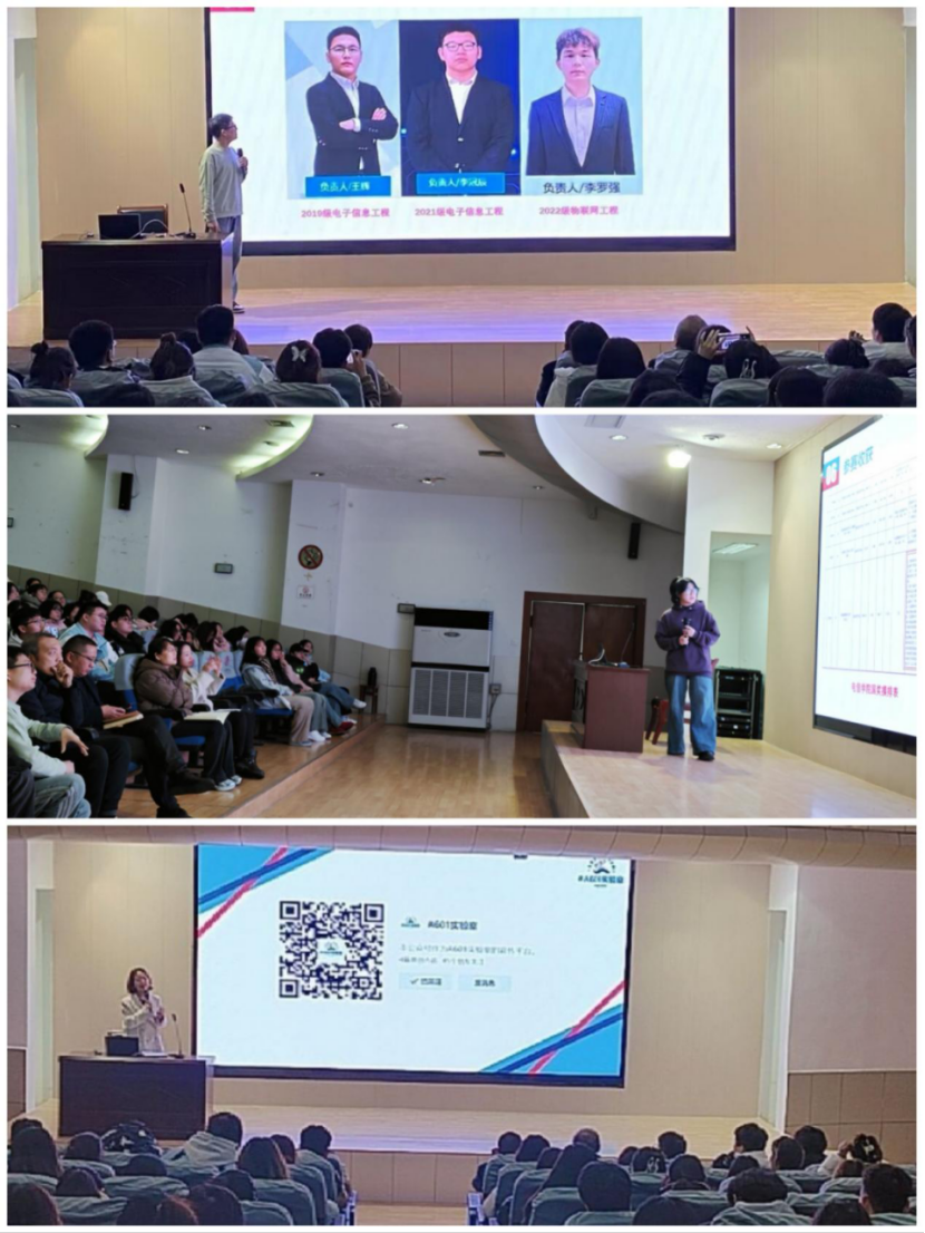 活动伊始,电信学院A601实验室团队负责人李罗强同学率先登台,他结合自身经历,深入剖析了从项目选题、团队组建、方案策划到竞赛实战的各个环节,为台下同学提供了全面且实用的参赛经验。随后,团队成员田舒冉同学分享了在竞赛过程中的成长与收获,她提到,参与创新创业竞赛不仅提升了专业技能,更培养了坚韧不拔的意志和团队协作精神,让大家深刻认识到竞赛对于个人综合素质提升的重要性。